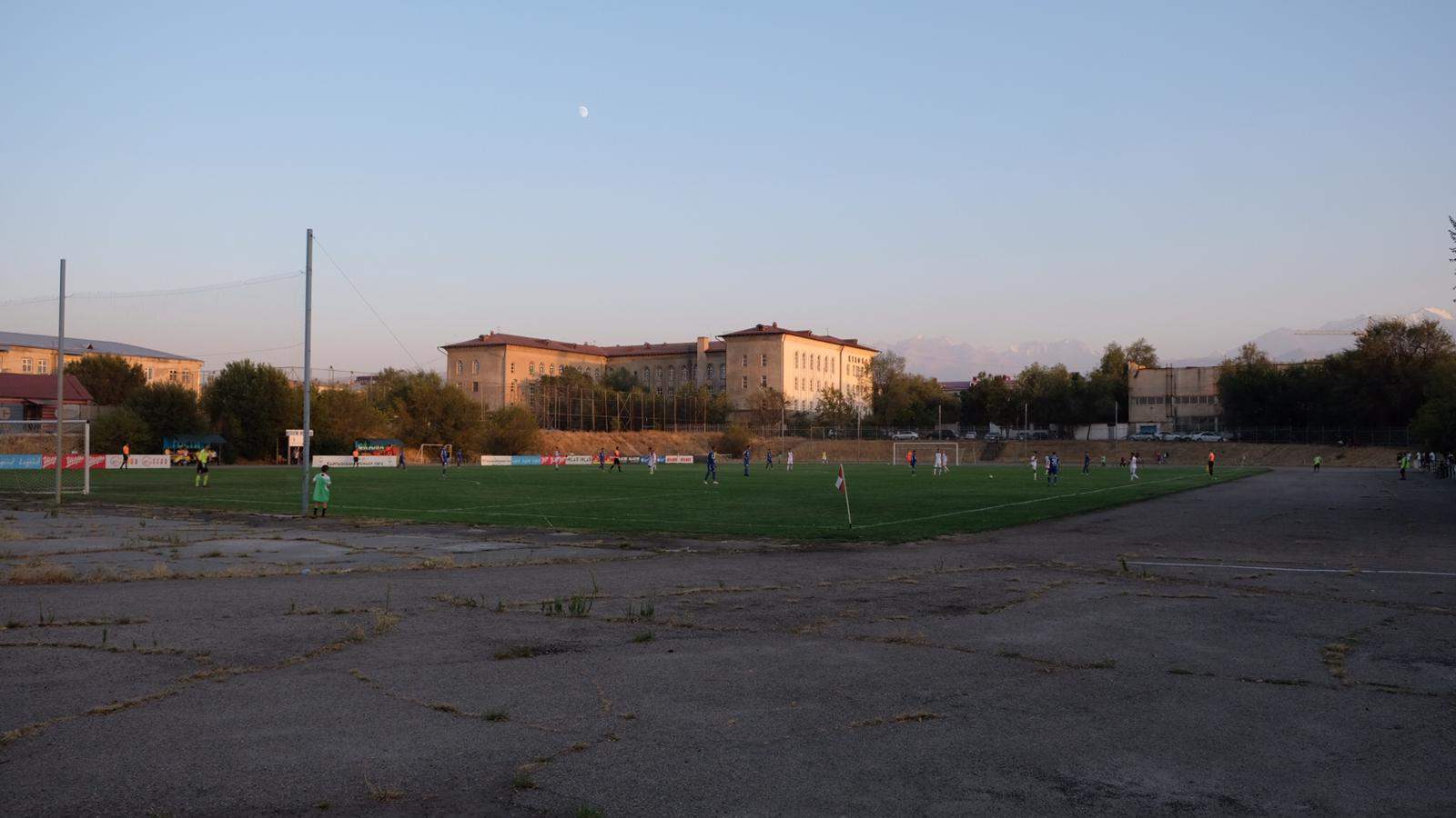 Direkt neben uns sitzt der Radiomann und überträgt live. Dordoi Bishkek gegen Alga Bishkek (2 : 3, gutes und spannendes Spiel), Eintritt frei. In den blauen Containern sind die Mannschaftsduschen, im benachbarten Freibad kann man sich in der Halbzeit eine Limo holen. Die gesamte Technik (Stadionbeschallung, drei TV-Kameras und mehrere Laptops) läuft über eine einzige Steckerleiste und im vorletzten Foto kassiert der Torwart der Siegermannschaft unmittelbar nach dem Spiel die Glückwünsche seines Sohnes.