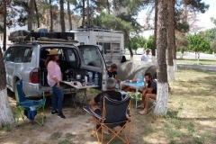 Also nochmal: Eigentlich wollten wir gestern die 275 Kilometer von Samarkand nach Taschkent fahren. Aber wir haben lange geschlafen (wegen Hochzeit vorgestern 🙄), bei den Kanadiern gesessen, mit den Österreichern Faxen gemacht und danach getrödelt und daher nur die Hälfte des Weges geschafft. Es ist soo schön, Zeit zu haben beim unterwegs sein.